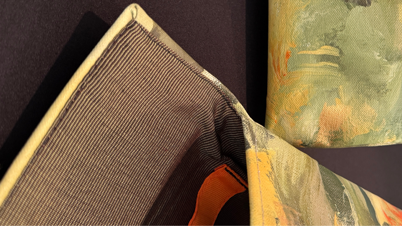 Grounded in nature’s richness, Earthen Hues blends soft greens and organic textures inspired by Florida’s lush landscape. Each clutch is cut from a large canvas hand-painted by Caryl, ensuring a uniquely expressive composition.